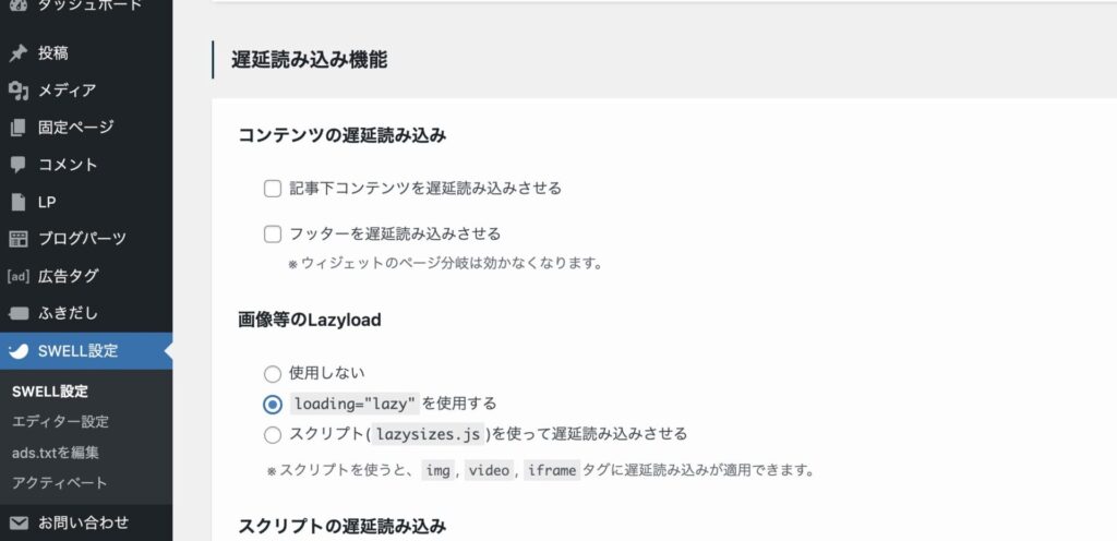 swell設定>画像等のLazyload>loading=”lazy”を使用するを選択